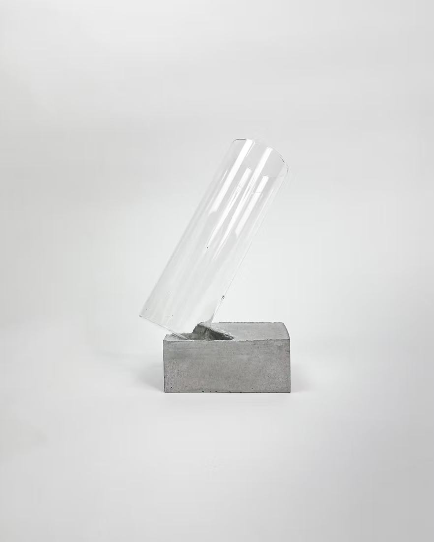 This Vase imitates natural forms and plays with the tension between frgaile and brutalist materials - creating the illusion of a tilting vase that breaks through the concrete base.